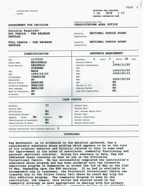 It looks like they’ll find out about my parole – what’s going on with the assessment. I gave my mother a Holland College application to submit so hopefully things will fall into place.