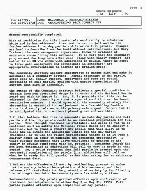 Richard got out today. He left me his number so I can call him in Toronto. … I heard today that John B. took a month off. He must be in the Detox. I’ll be pissed off if I found out he took my spot in Summerside. Anything’s possible with these bastards around here. He should have went while Susan was still here. There won’t be any access to the computers for a month now. What a fucked up place this is. Twenty six more days, well maybe a few less.