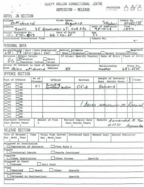 On Wednesday morning we were supposed to have our group meeting at 8:30 am. The staff came in and told us they had something urgent to deal with. Shortly afterward an RCMP car pulled up in front of the house and two officers walked into the office. I was then called in. Will C. waved a piece of paper in my face and said,